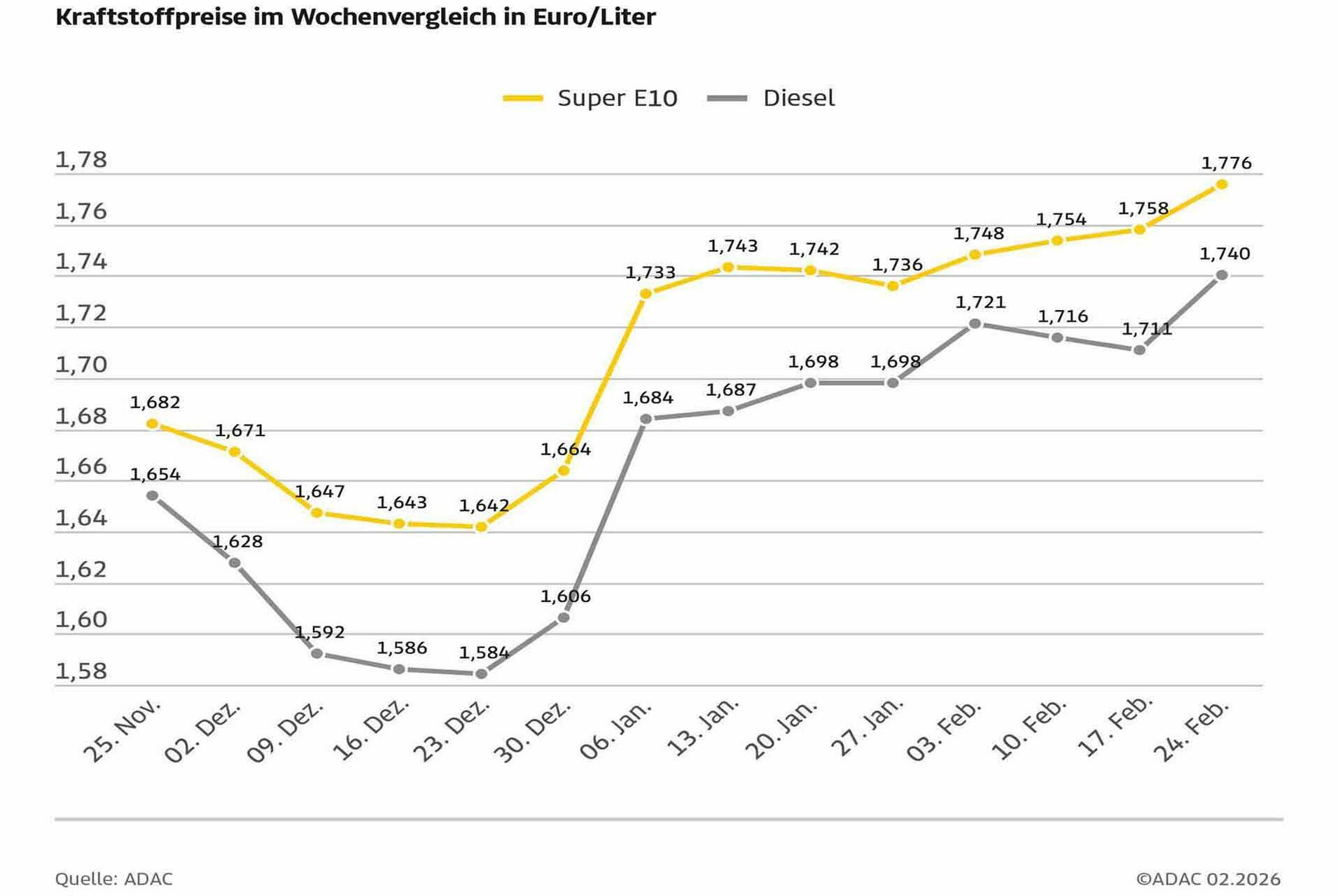 ADAC: Kraftstoffpreise so hoch wie zuletzt 2024 - Diesel 3 Cent teurer als in der Vorwoche - Benzinpreis steigt um 1,8 Cent - Ölpreis vier US-Dollar höher